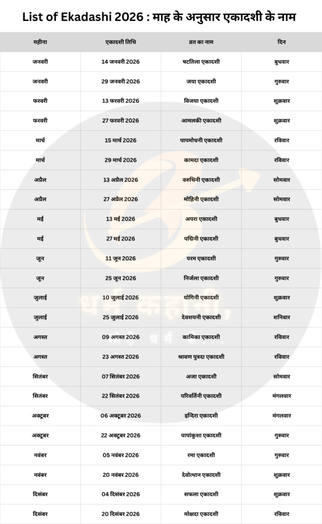 निचे हमने साल 2026 की सम्पूर्ण एकादशी की लिस्ट महीने व तारीख के साथ दी है यदि आप किसी एकादशी के बारे में सम्पूर्ण जानकारी चाहते हैं तो एकादशी के नाम पर क्लिक कर आप एकादशी का महत्त्व, कथा जान सकते हैं।